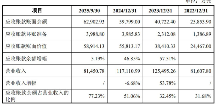 与此同期,公司的资金遍及千里淀于应收账款。报告期各期末,公司应收单子、应收账款和应收款项融资共计永诀为4.45亿元、7.81亿元、6.61亿元和6.40亿元,占总金钱比例为29.99%、41.42%、36.58%和34.20%。其中,应收账款账面余额为2.59亿元、4.07亿元、5.98亿元、6.3亿元,举座规模较大。大昌科技暗示,公司账龄在1年以内的应收账款占应收账款余额的比重95%以上,公司坏账准备计提充分,且报告期内公司前五大应收账款客户均为国内著名大型主机厂和汽车零部件制造商,公司与应收账款主要客户互助关系判辨,应收账款期后回款情况精粹,不存在较大的回款风险。