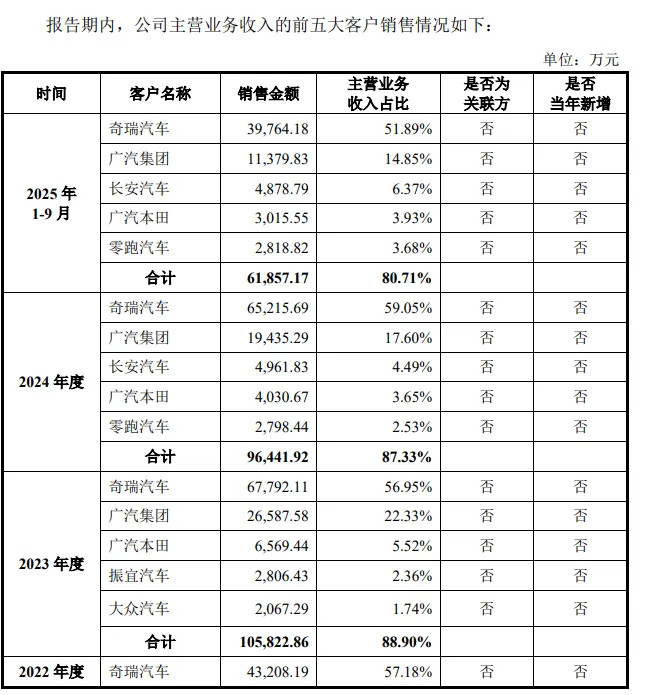 其中,对第一大客户奇瑞汽车的依赖尤为隆起。财务数据暴露,报告期内,公司对奇瑞汽车的销售收入为4.32亿元、6.78亿元、6.52亿元、3.98亿元,占当期主生意务收入的比例永诀为57.18%、56.95%、59.05%和51.89%,孝敬过半营收。