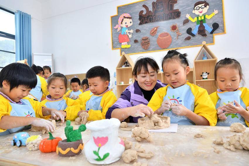 在保康县歇马镇中心幼儿园脾气泥工坊,孩子们在老师的指挥放学习制作泥塑作品。