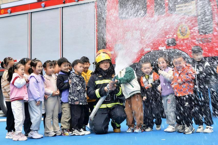在保康县县直机关第三幼儿园,小一又友在消防员的辅助下体验使用消防水枪。