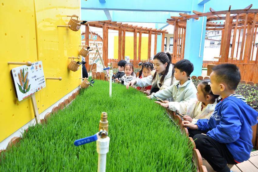 在保康县供销社幼儿园植物园,老师指挥孩子们意识小麦。