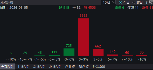 大河财立方音信,3月5日,A股阛阓反弹走高,松手10:43发稿,创业板指盘中一度拉升涨超3%,沪指涨0.69%,深证成指涨1.58%,科创综指涨2.26%。MiniLED、CPO、电网设立等板块涨幅居前,澳门十大信誉网络赌城航运海运、油气设备等板块调养。全阛阓超4500家个股上升。