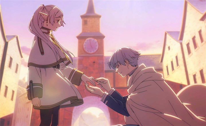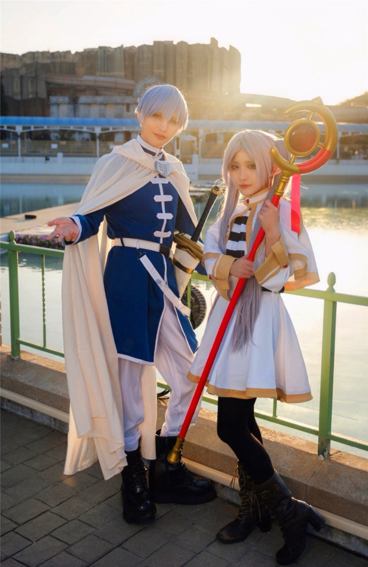 丈夫复原了辛好意思尔美艳性的银灰色短发、蓝白相间的制服、白色披风,以及腰间的佩剑;太太复原了芙莉莲美艳性的浅银灰色双马尾、精灵长耳、白色法师袍,以及她手中那根带有红色对持和金色遮挡的法杖。温暖的金色阳光洒在东说念主物身上,营造出一种温暖又略带怀旧的氛围,举座呈现出一种缜密又充满故事感的视觉成果。“芙莉莲”对“辛好意思尔”充满了爱意!