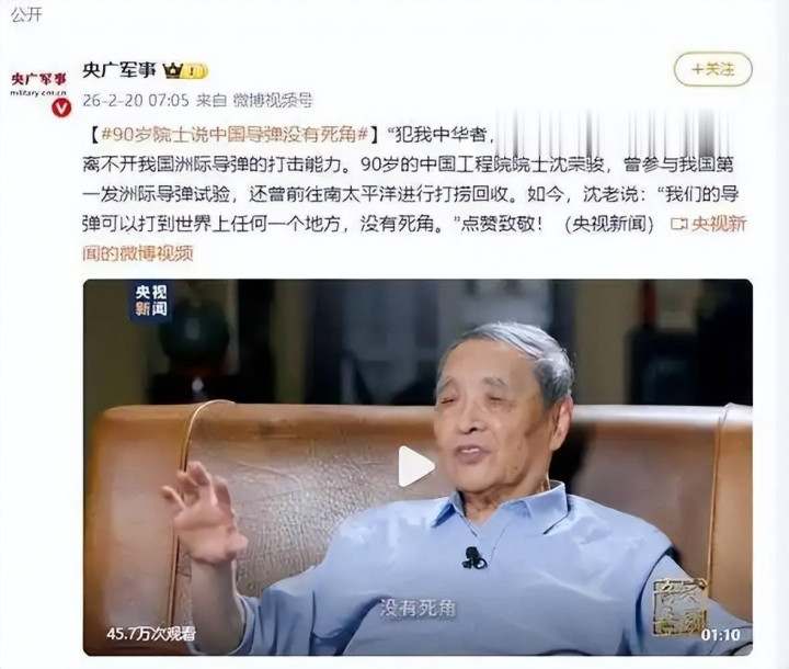 2026 年头,一段采访视频在全网刷屏,莫得激越的配景音乐,莫得炫酷的殊效裁剪,镜头里的沈荣骏院士头发斑白、目光温顺,语言口吻就像邻里父老拉家常,可那句 “咱们的导弹不错打到世界上任何一个场地,莫得死角”,却让亿万国东谈主短暂破防。