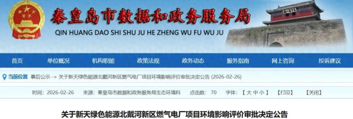 前段时辰,秦皇岛数据和行政业绩局发布对于新天绿色动力北戴河新区燃气电厂神志环境影响评价审批决定公告: