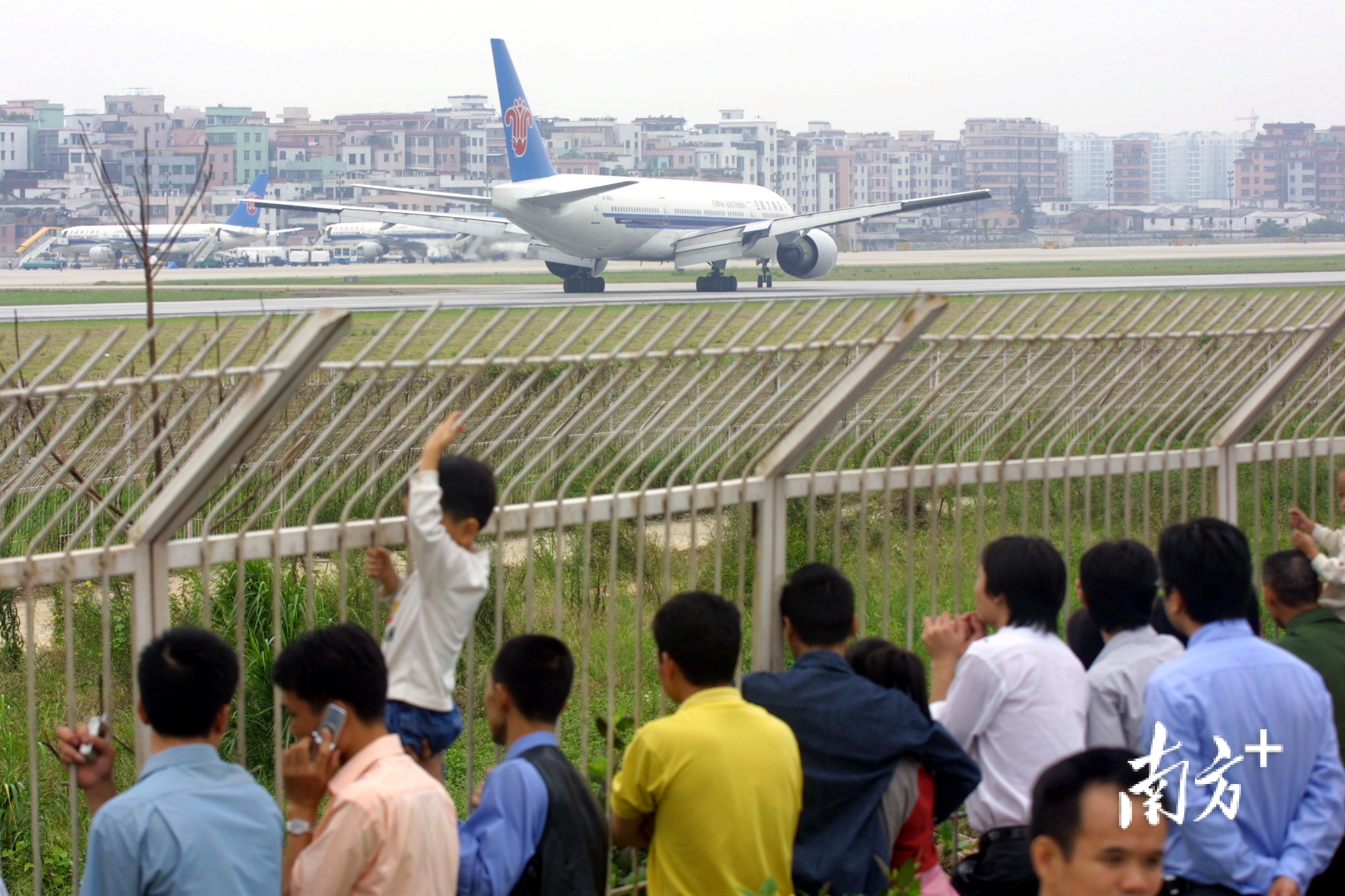 2004年春运,市民在机场外不雅看飞机腾飞,彼时,乘飞机回家过年搭客较少。陈军 云轩 摄