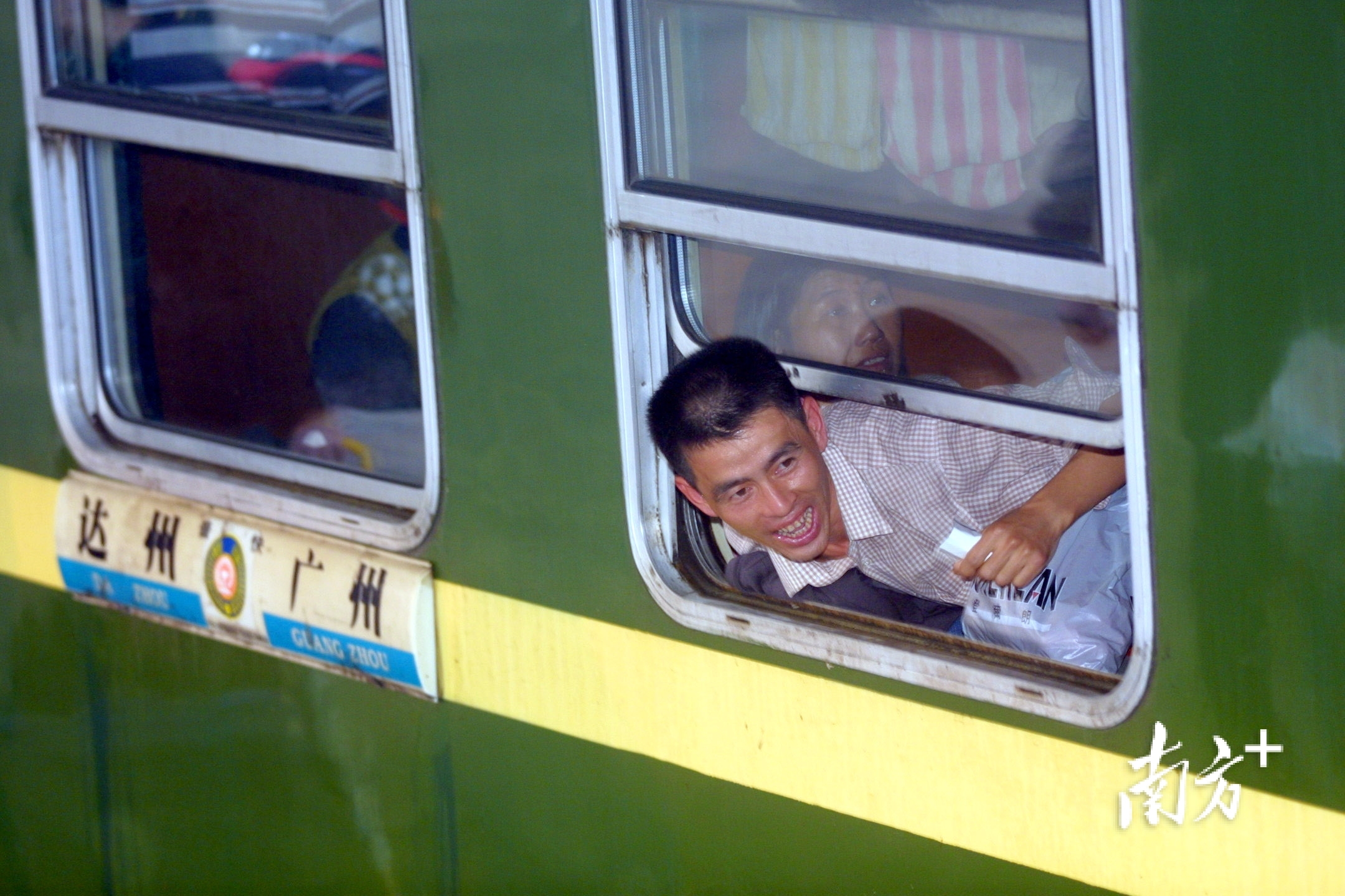 2004年1月,广州火车站,一位告捷登上车的搭客从车窗探训诫体甘心地对着还在车下的同伴喊叫。陈军 摄