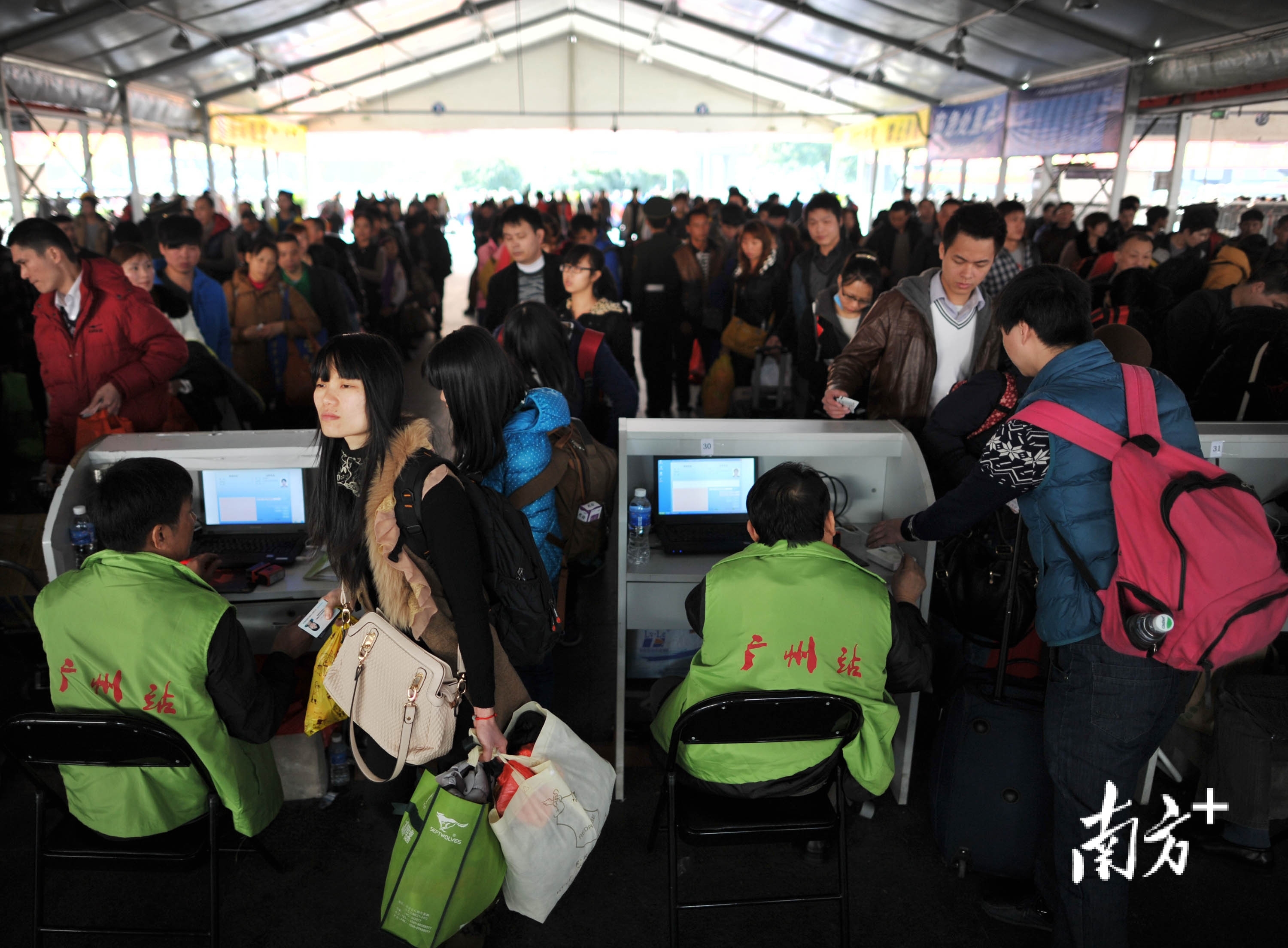 2014年春运,广州火车站,搭客列队东谈主工检票后进站候车。南边农村报记者 肖雄 摄