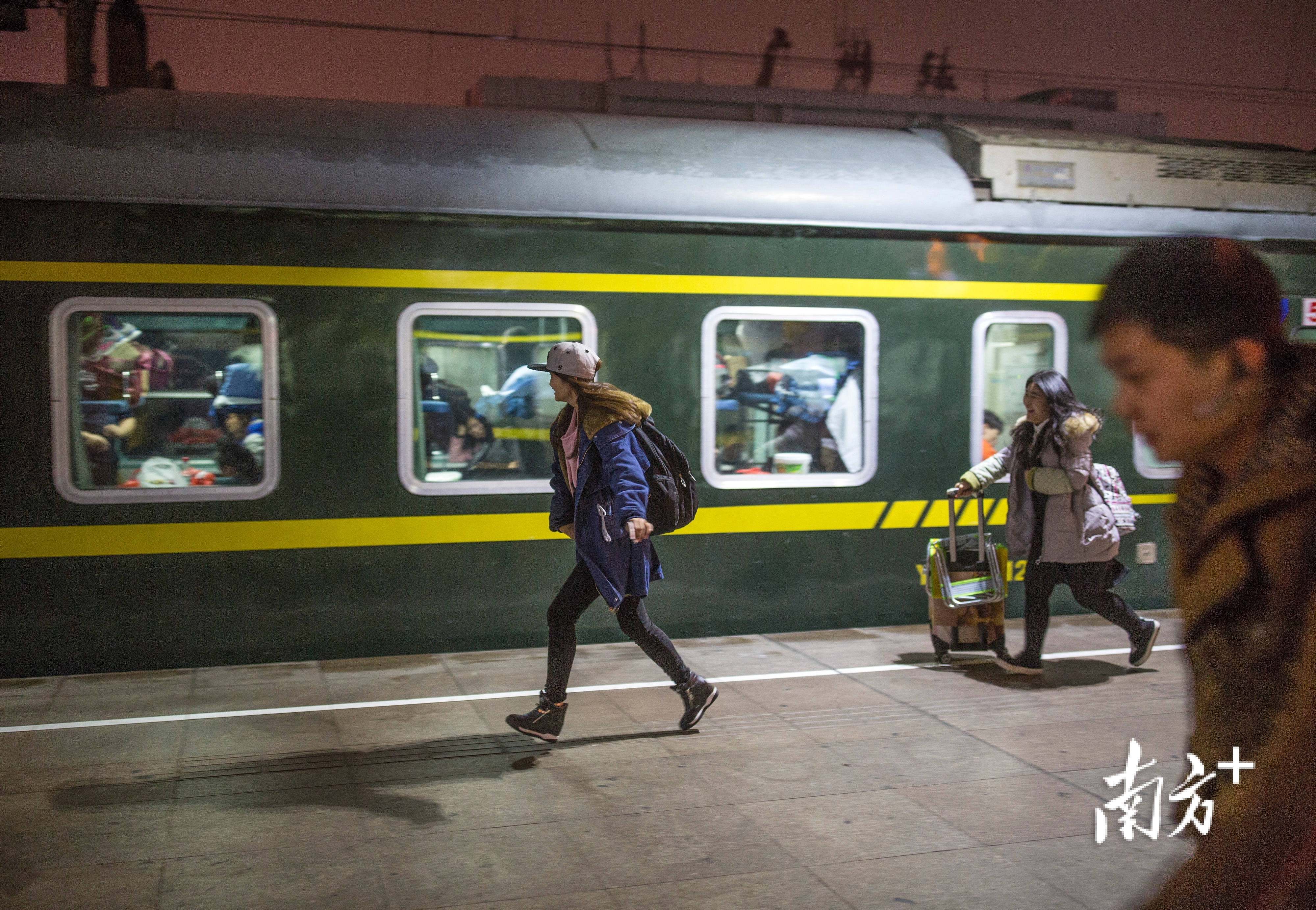 2017年1月16日,广州火车站,绿皮火车靠岸在站台,两名年青女子在月台上奔突。南边日报记者 张由琼 万稳龙 摄