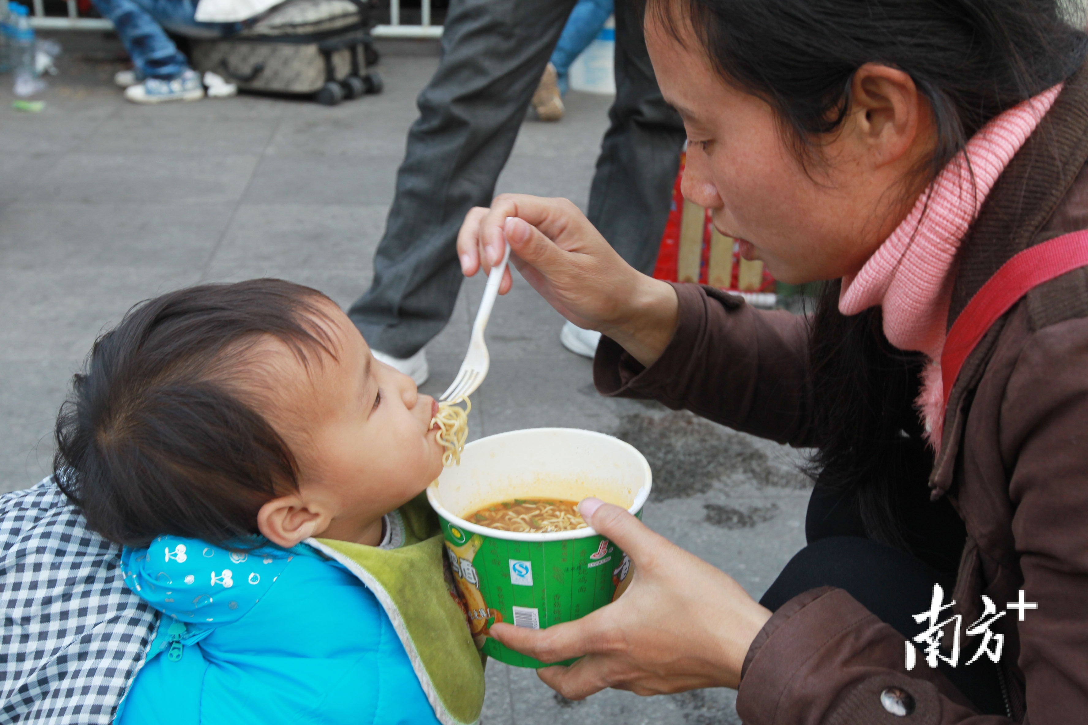 2013年春运,广州火车站候车大厅,一位母亲喂孩子吃便捷面。南边日报记者 梁文祥 摄